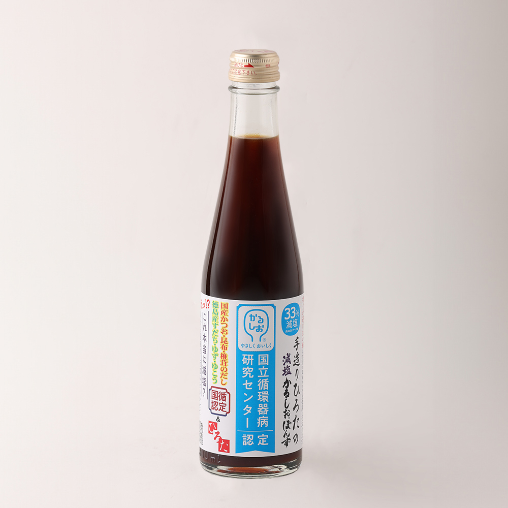 【減塩かるしおぽんず】しょうゆ(本醸造)(大豆・小麦を含む)(国内製造)、醸造酢、すだち果汁、ゆこう果汁、ゆず果汁、本みりん、砂糖、風味原料(かつお節、さば節、宗田節、こんぶ、しいたけ)/調味料(アミノ酸等)